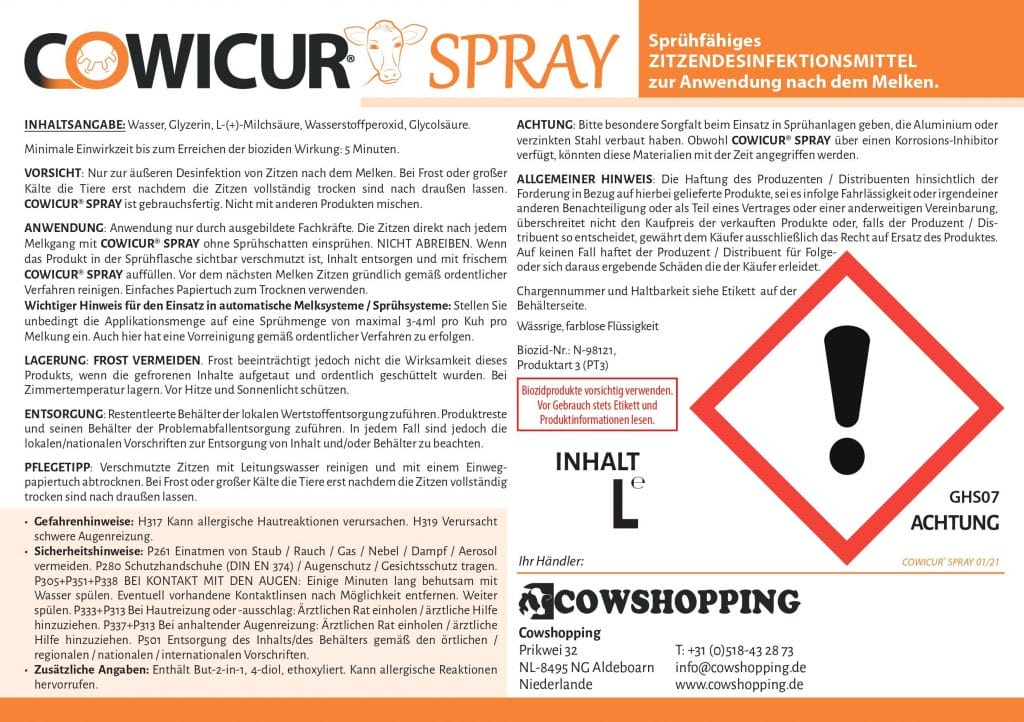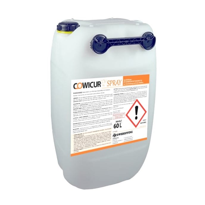 Der 60-Liter-Kanister mit DIN71 Verschluss ist für den Einsatz im Melkroboter geeignet (Sauglanze passt in die Öffnung). Das Spray ist farblos, so dass der Laser / Sensor des Melkroboters nicht abgedeckt wird.